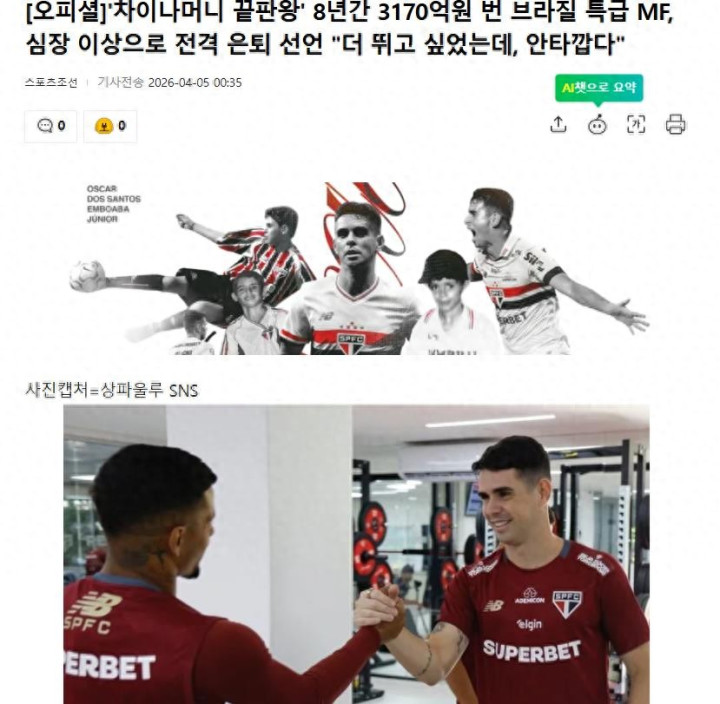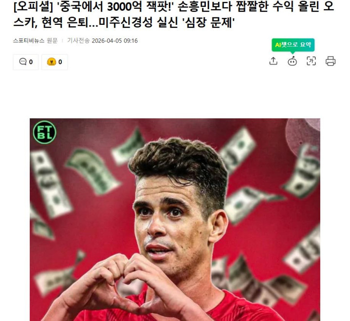 首先来看韩国媒体,他们的报道重点不是奥斯卡退役,而是不约而同地指向了奥斯卡在中国赚到的巨额收入,一个标题写的是“中国金元古代足球 最大赢家”,8年狂赚3170亿韩元的巴西中场球员宣布退役,还有多家韩国媒体都在标题中提到,奥斯卡在中国赢得3000亿韩元大奖,在中超收入是孙兴慜的2倍等等话题。